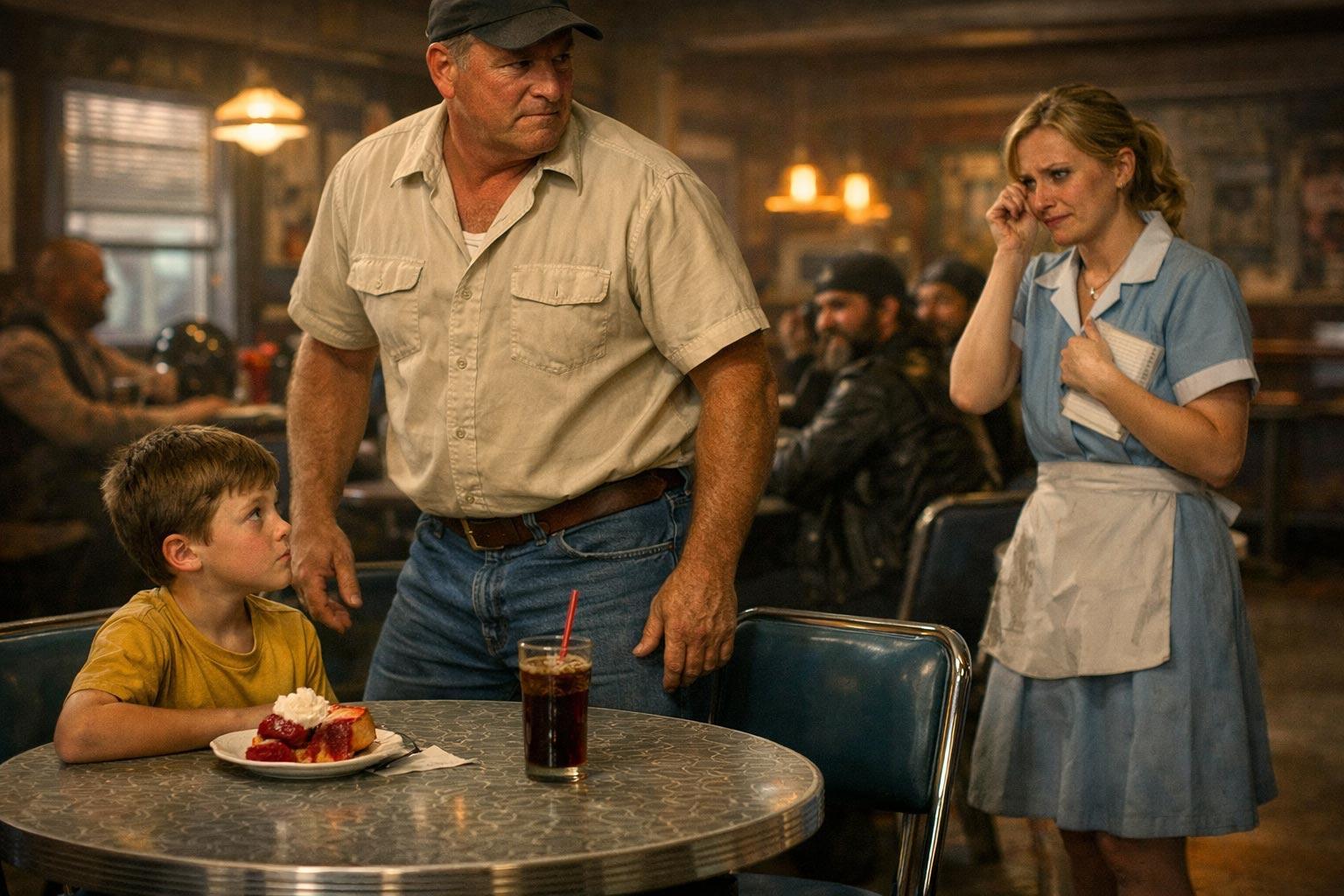 Leather jackets. Denim jeans. Heavy boots with chains and loose change clinking every time they moved. Their helmets hit the table hard, and the whole room changed.