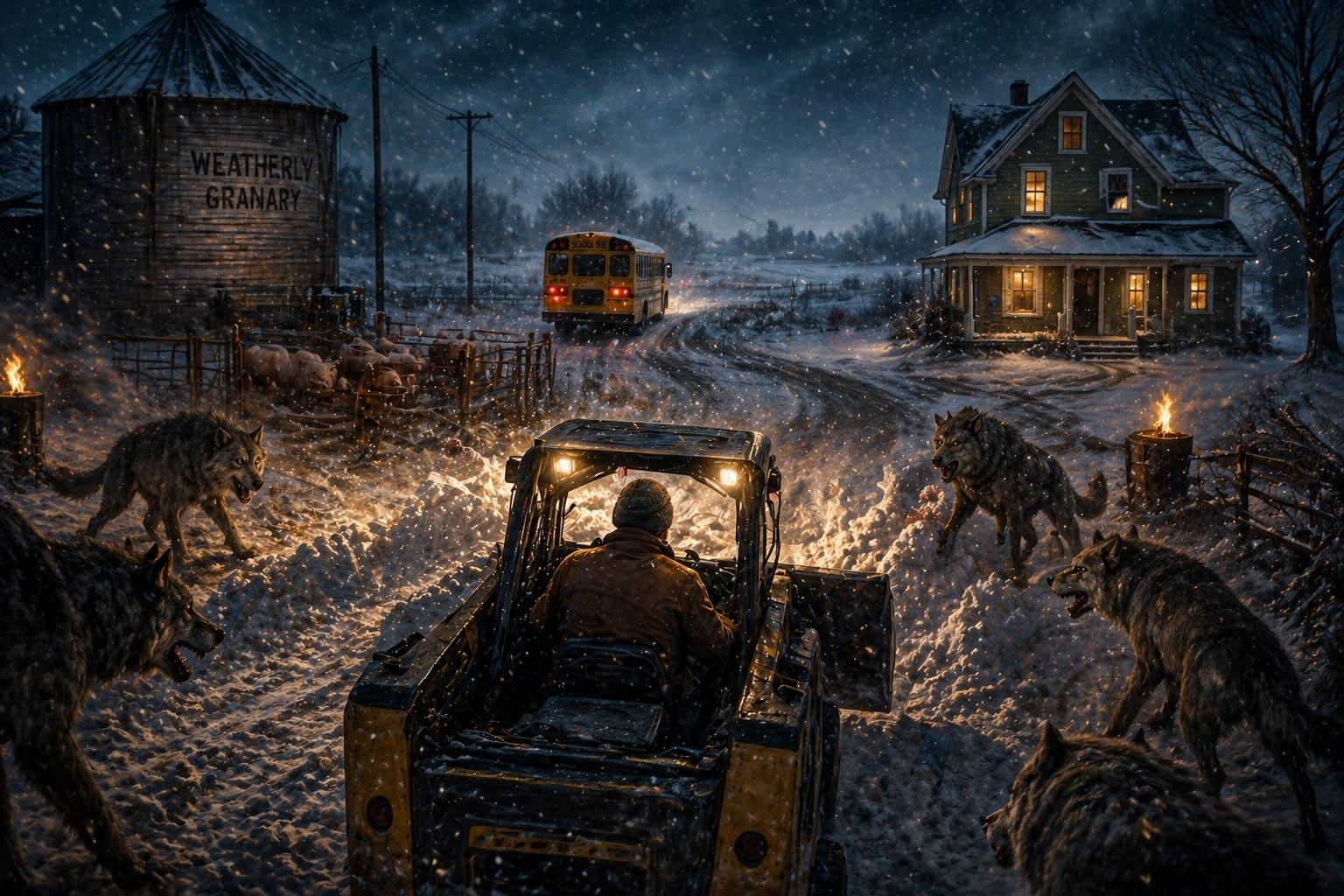 Then somehow I was at the granary, trying to keep wolves away from the hogs while clearing the driveway with the Bobcat.